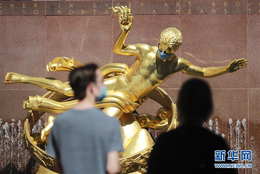 6月22日,在美國紐約洛克菲勒中心,一座雕像被“戴”上口罩。美國約翰斯·霍普金斯大學(xué)22日發(fā)布的新冠疫情最新統(tǒng)計數(shù)據(jù)顯示,美國累計死亡病例超過12萬例。新華社記者王迎攝