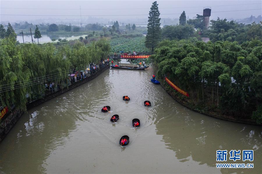 6月23日,東林鎮(zhèn)村民在泉心村荷花池參加端午劃菱桶趣味活動(無人機照片)。當(dāng)日,浙江省湖州市東林鎮(zhèn)在泉心村荷花池舉辦“慶端午劃菱桶”趣味活動。村民們劃著菱桶在水面上你追我趕,同時采收荷花和蓮蓬,呈現(xiàn)出水鄉(xiāng)特有的端午節(jié)日氛圍。在河網(wǎng)密布的東林鎮(zhèn),菱桶是水鄉(xiāng)家家戶戶都有的一種傳統(tǒng)水上勞動工具,村民在捕魚、采菱、采荷時都要用到。新華社記者徐昱攝