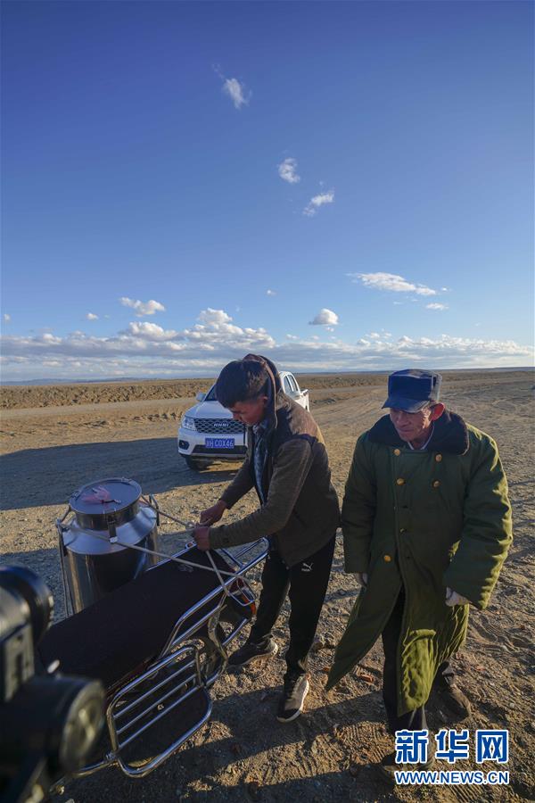 在吉木乃縣萬(wàn)駝園內(nèi),牧民米拉木別克·阿依提克(右)在兒子的幫助下準(zhǔn)備騎著摩托車去交駝奶(6月21日攝)。新華社記者趙戈攝