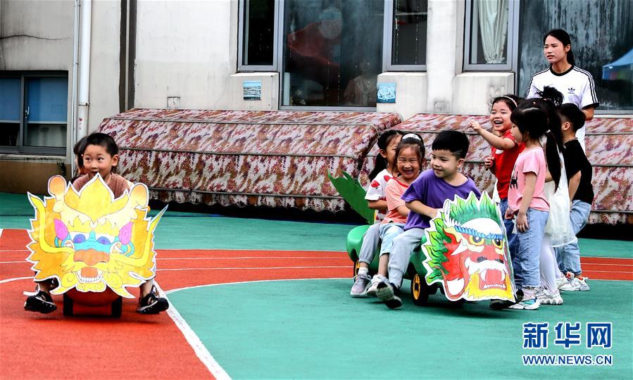 6月23日,長興縣李家巷鎮(zhèn)中心幼兒園的孩子們一起在玩自創(chuàng)“劃龍舟”游戲。為了迎接即將到來的端午節(jié),浙江省湖州市長興縣各個(gè)幼兒園開展“品民俗迎端午”主題活動,讓小朋友們體驗(yàn)傳統(tǒng)民俗文化。新華社記者徐昱攝