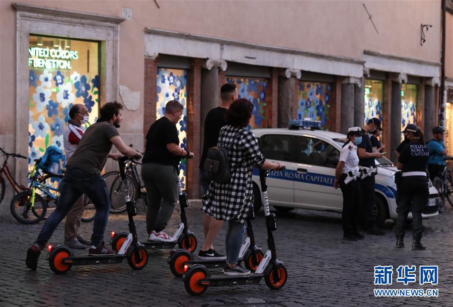 6月23日,在意大利首都羅馬,人們騎著電動(dòng)踏板車(chē)在城市中穿行。新華社記者程婷婷攝