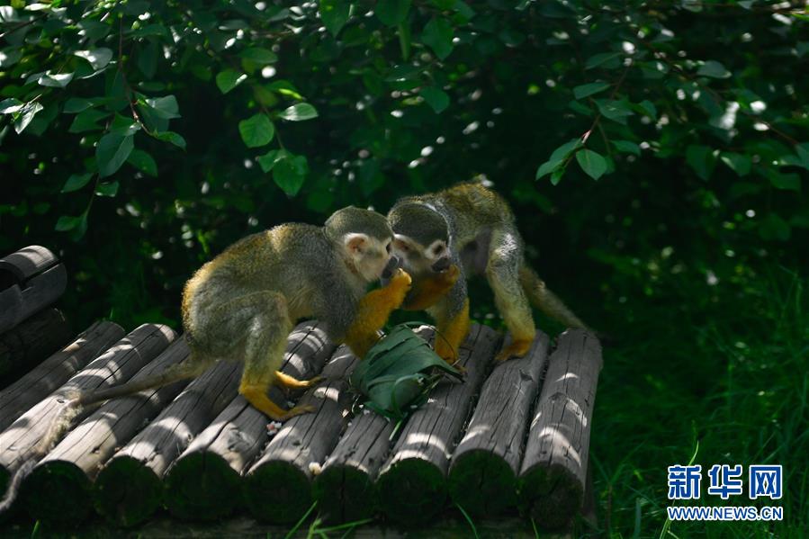 6月25日,在青海省西寧野生動(dòng)物園,兩只松鼠猴在享用小朋友們包的粽子。新華社記者 張龍 攝