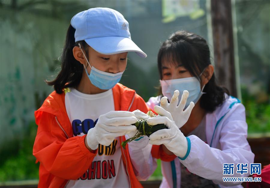 6月25日,在青海省西寧野生動(dòng)物園,一位小朋友在母親幫助下包粽子。新華社記者 張龍 攝