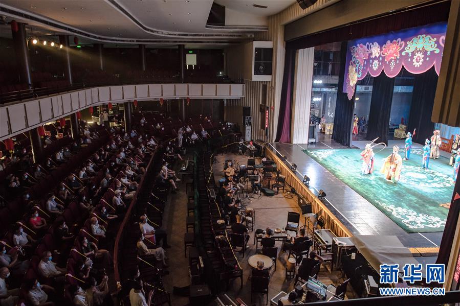 6月26日,市民掃健康碼登記后進入武漢市人民劇院。當日,武漢市中心7家劇場恢復開放,各大文藝院團恢復線下演出,市民再次坐在劇場內(nèi)觀看“戲碼頭”上群星云集、百戲薈萃。新華社記者 肖藝九 攝