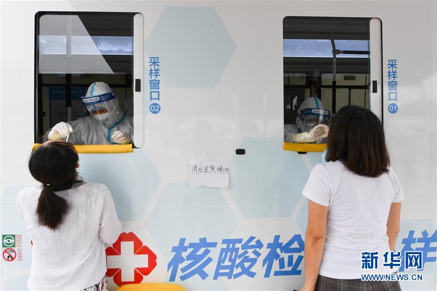 6月28日,在北京市西城區(qū)北京展覽館南側(cè)的露天廣場(chǎng)核酸檢測(cè)采樣點(diǎn),核酸檢測(cè)采樣車(chē)內(nèi)的醫(yī)護(hù)人員為前來(lái)做檢測(cè)的人員進(jìn)行采樣。新華社記者鞠煥宗攝