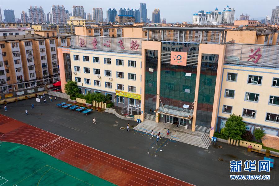6月29日,在吉林市第一實驗小學,學生陸續(xù)進入教學樓(無人機照片)。新華社記者張楠攝