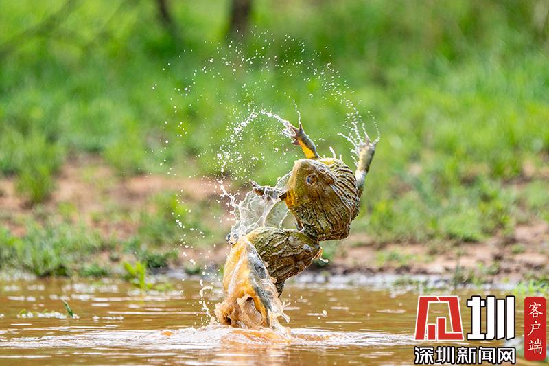 2020年6月30日?qǐng)?bào)道(具體拍攝時(shí)間不詳),南非波羅克瓦克,兩只雄性非洲牛蛙為了爭(zhēng)奪雌性牛蛙,在池塘中打架,這樣的情形十分罕見(jiàn)。畫面中,戰(zhàn)況十分激烈,一只非洲牛蛙在另外一只試圖逃到池塘邊緣時(shí)撕咬對(duì)手,甚至將另外一只拋向空中。這些精彩的照片是由南非開(kāi)普敦?cái)z影師Temujin Johnson拍攝的。