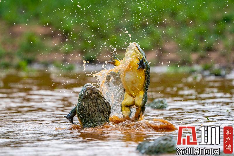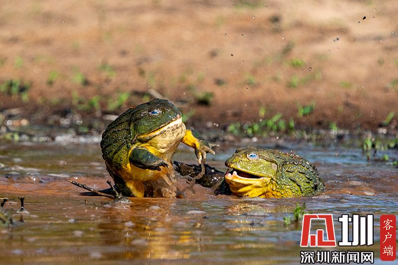 2020年6月30日報道(具體拍攝時間不詳),南非波羅克瓦克,兩只雄性非洲牛蛙為了爭奪雌性牛蛙,在池塘中打架,這樣的情形十分罕見。畫面中,戰(zhàn)況十分激烈,一只非洲牛蛙在另外一只試圖逃到池塘邊緣時撕咬對手,甚至將另外一只拋向空中。這些精彩的照片是由南非開普敦攝影師Temujin Johnson拍攝的。