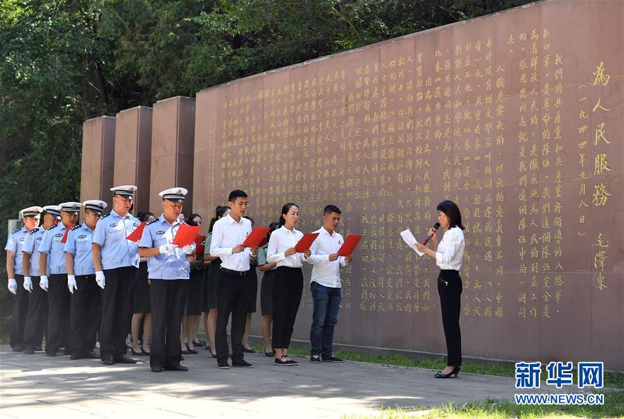 6月29日,在延安市張思德廣場(chǎng),黨員干部在誦讀《為人民服務(wù)》。臨近“七一”,革命圣地延安的黨員干部紛紛來到紅色景區(qū),舉行主題黨課、現(xiàn)場(chǎng)教學(xué)、重溫入黨誓詞等活動(dòng)。新華社記者張博文攝