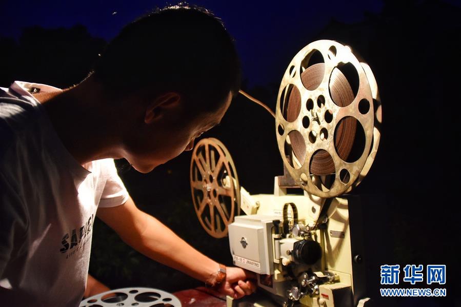 6月30日晚,電影放映中,朱強在更換膠片。新華社記者鄭夢雨攝