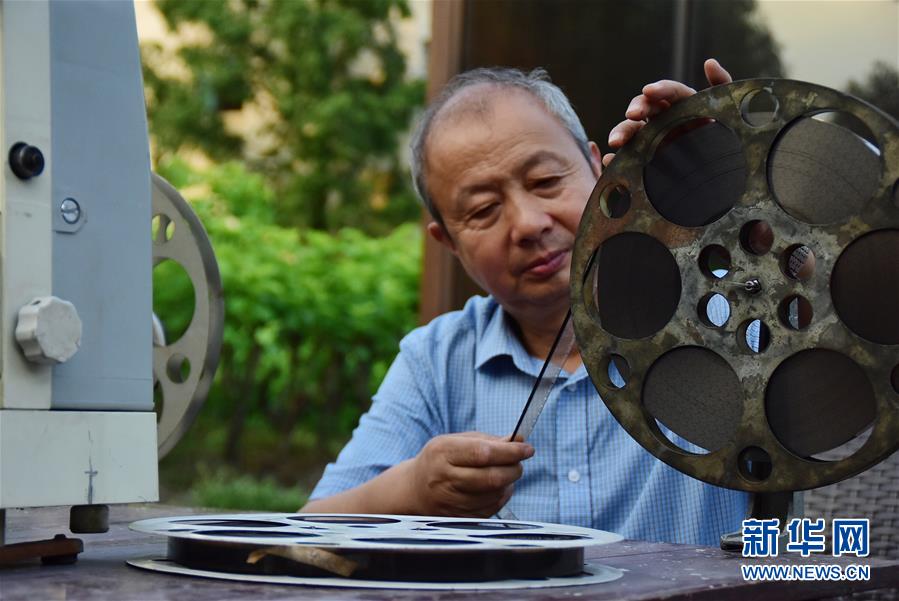 6月30日,朱生榮在當(dāng)晚電影開播前將膠片調(diào)至起始幀。新華社記者鄭夢(mèng)雨攝