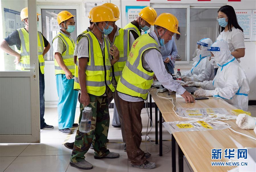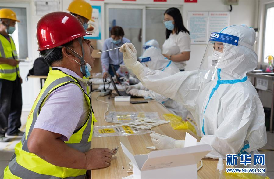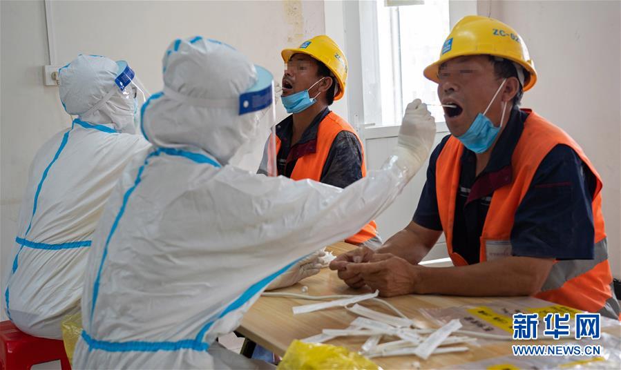 7月2日,在北京市大興區(qū)中建三局二公司北京公司一項目建筑工地的臨時核酸檢測采樣點,醫(yī)護人員為建筑工地人員采集咽拭子。新華社記者才揚攝