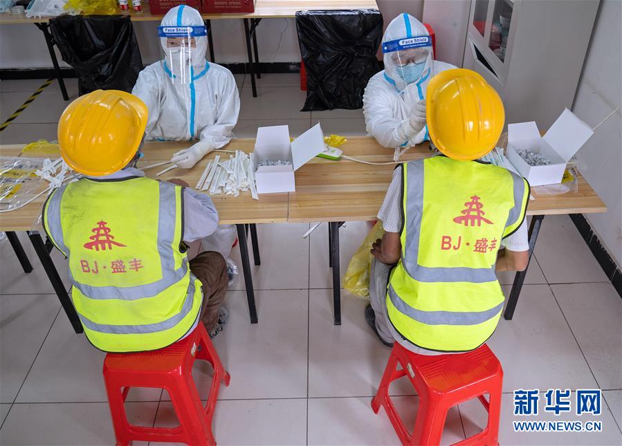 當日,在北京市大興區(qū)中建三局二公司北京公司一項目建筑工地的臨時核酸檢測采樣點,醫(yī)護人員為1353名建筑工地人員進行核酸檢測采樣。新華社記者才揚攝
