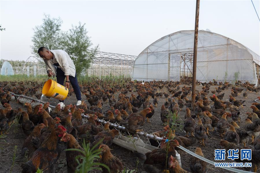 7月1日,在位于黑龍江省五大連池市桑慶軍的雞場上,桑慶軍在給雞喂水。新華社記者謝劍飛攝