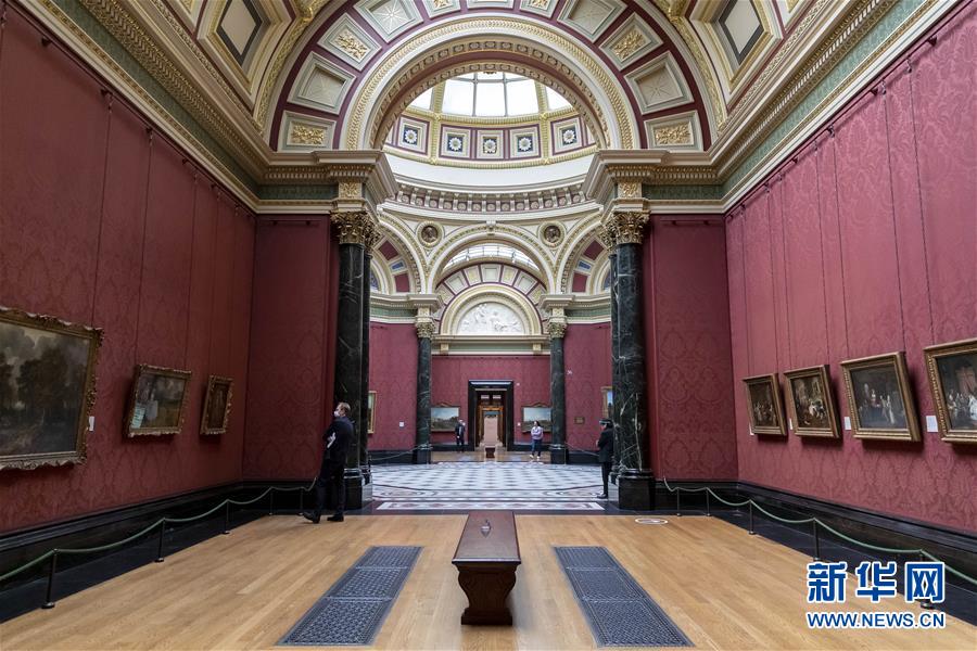 7月4日,參觀者佩戴口罩在英國國家美術(shù)館的媒體開放日上參觀。受新冠疫情影響而關(guān)閉的英國國家美術(shù)館將于7月8日重新對(duì)公眾開放,成為倫敦首批開門迎客的博物館、美術(shù)館。參觀者需提前網(wǎng)上預(yù)約參觀時(shí)段,全程佩戴口罩且保持安全距離。新華社記者韓巖攝