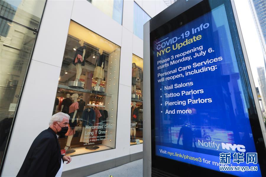 7月4日,一名行人從美國紐約第五大道顯示新冠疫情最新情況的信息屏旁經過。當日是美國獨立日,美國多地疫情仍面臨嚴峻形勢。美國約翰斯·霍普金斯大學實時統計數據顯示,美國累計新冠確診病例4日已超過280萬例。新華社記者王迎攝