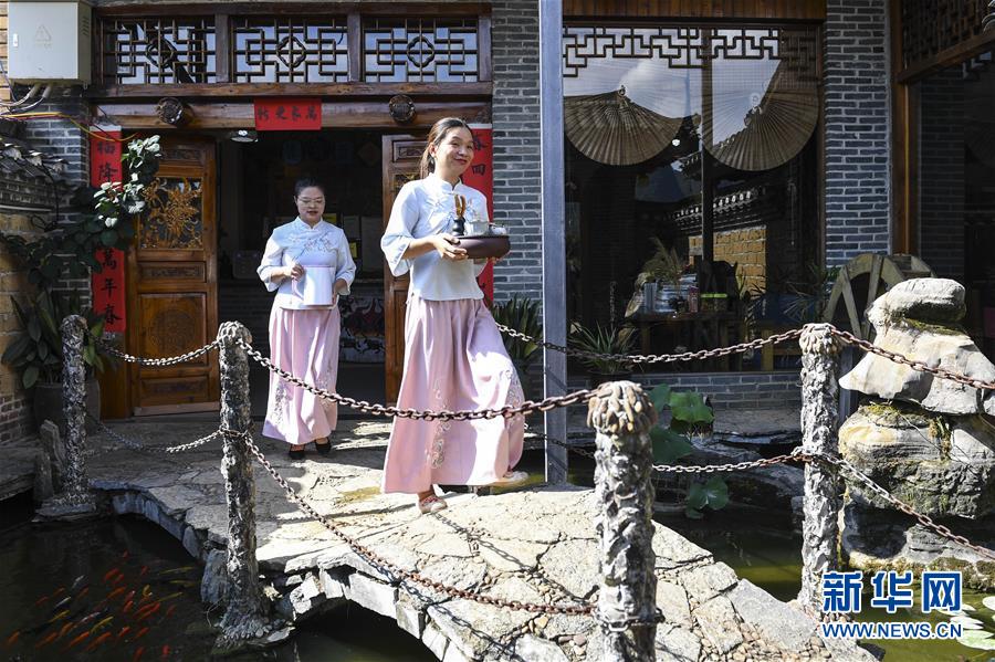 7月4日,服務(wù)員在廣西陽朔一家民宿內(nèi)忙碌。她們是陽朔縣陽朔鎮(zhèn)的村民。新華社記者曹祎銘攝