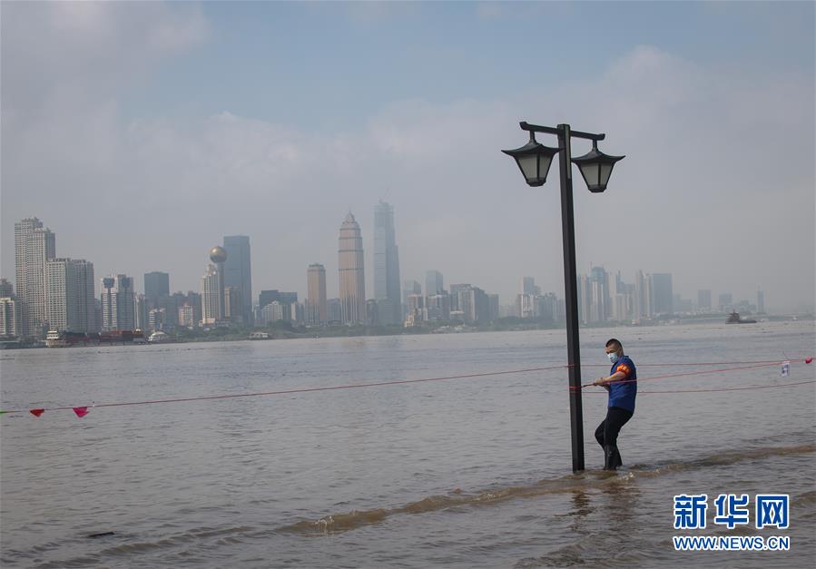 7月6日,工作人員在武昌江灘上拉警戒線。新華社記者肖藝九攝