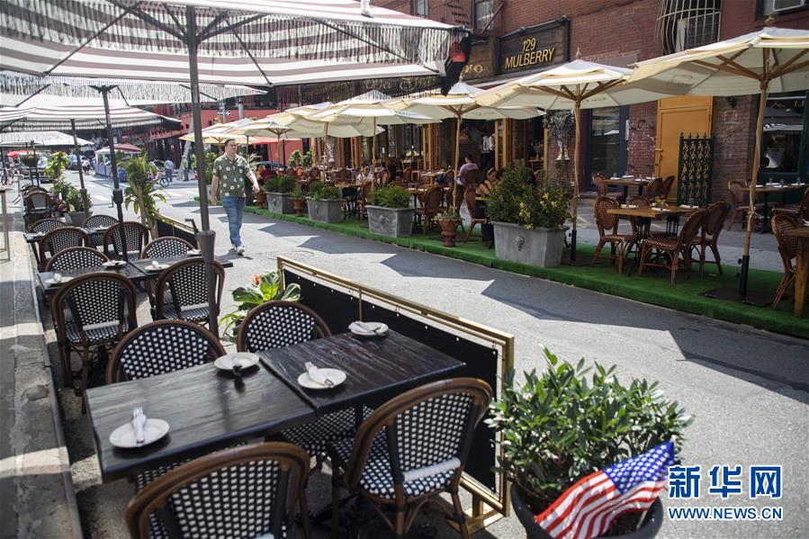 7月6日,一名男子從美國紐約一家餐廳的戶外餐區(qū)旁經(jīng)過。當天,紐約進入重啟第三階段,美甲店、按摩店等個人護理業(yè)在經(jīng)歷近4個月的停業(yè)后被允許重新開放。因防疫需要,原本應(yīng)在第三階段開放的餐飲業(yè)室內(nèi)就餐仍處于暫停狀態(tài)。新華社記者王迎攝