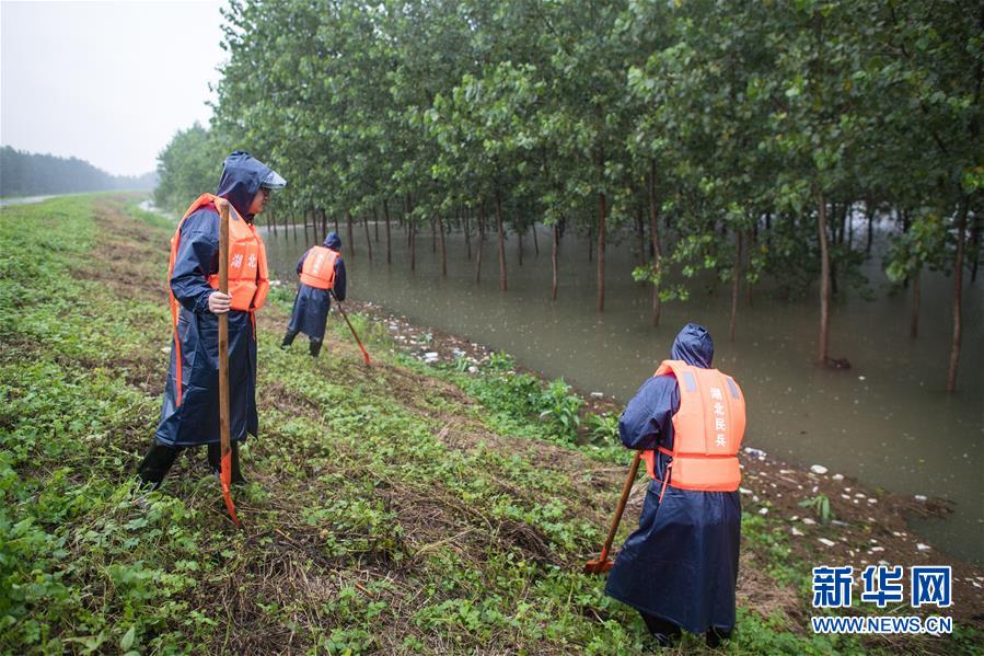 7月7日,武漢市洪山區(qū)防汛人員在武漢天興洲江堤觀察水情。