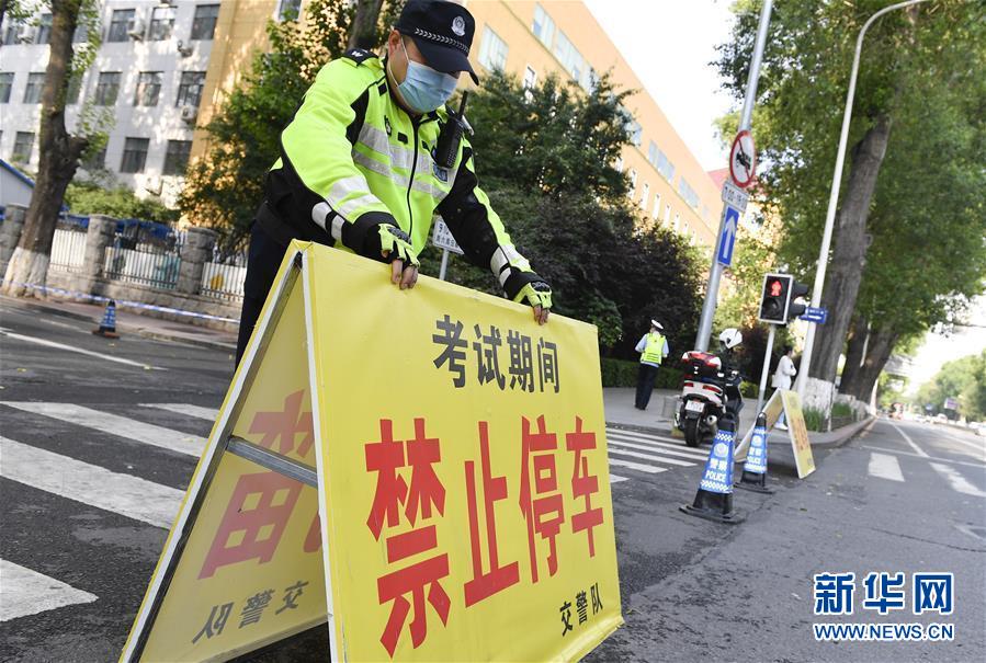 7月7日,在吉林省長(zhǎng)春市的東北師范大學(xué)附屬中學(xué)考點(diǎn)外,執(zhí)勤交警在道路上架設(shè)提示牌。當(dāng)日,2020年高考拉開(kāi)帷幕。新華社記者許暢攝