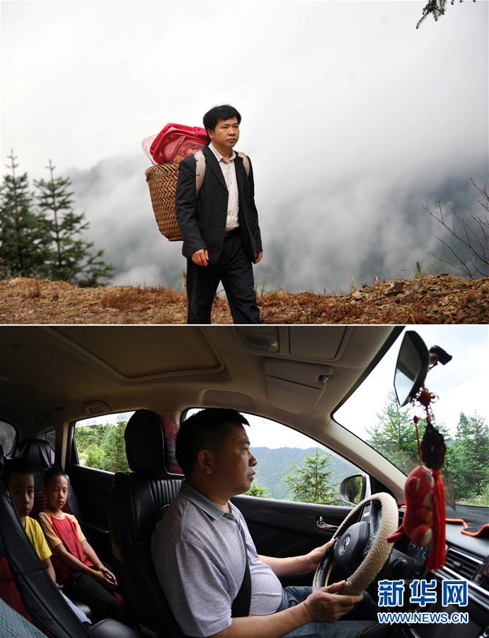 這是一張拼版照片,上圖:在廣西龍勝龍脊鎮(zhèn)江柳村,余啟貴老師背著背簍走在去學(xué)校的路上(2013年2月26日攝);下圖:在廣西龍勝龍脊鎮(zhèn)江柳村,余啟貴老師開著自己的汽車帶著學(xué)生去學(xué)校(7月7日攝)。新華社記者陸波岸攝
