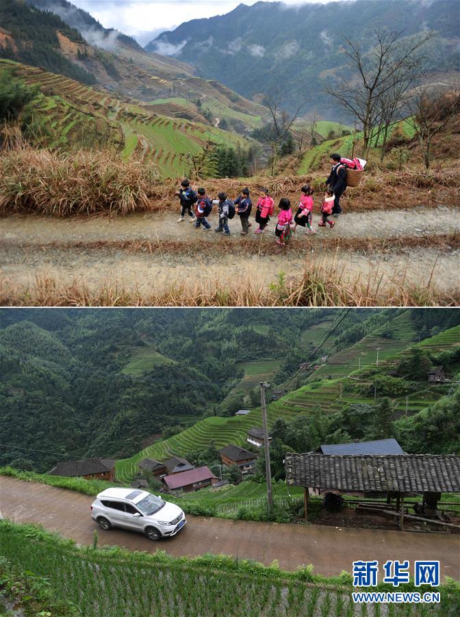 這是一張拼版照片,上圖:在廣西龍勝龍脊鎮(zhèn)江柳村,余啟貴老師背著背簍領(lǐng)著學(xué)生去學(xué)校(2013年2月26日攝);下圖:在廣西龍勝龍脊鎮(zhèn)江柳村,余啟貴老師開(kāi)著自己的汽車(chē)帶著學(xué)生去學(xué)校(7月7日攝)。新華社記者陸波岸攝