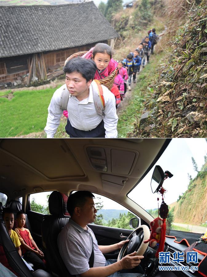 這是一張拼版照片,上圖:在廣西龍勝龍脊鎮(zhèn)江柳村,余啟貴老師在放學(xué)路上將一個(gè)走不動(dòng)了的孩子背在背簍里,領(lǐng)著其他孩子一起回家(2013年2月26日攝);下圖:在廣西龍勝龍脊鎮(zhèn)江柳村,余啟貴老師開(kāi)著自己的汽車帶著學(xué)生去學(xué)校(7月7日攝)。新華社記者陸波岸攝