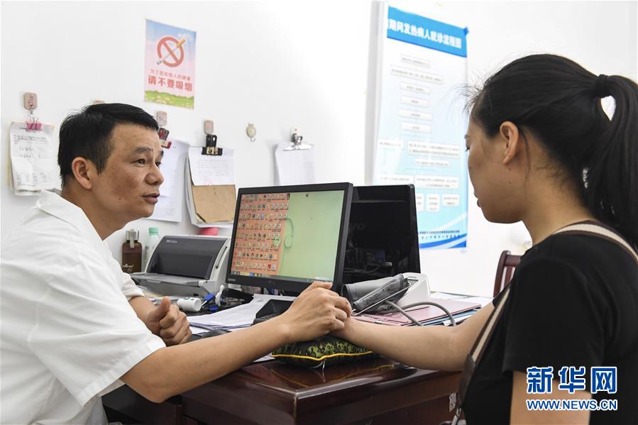 7月8日,在長垌鄉(xiāng)衛(wèi)生院,陶雷(左)給一名病人把脈。