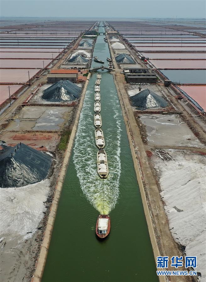 7月9日,唐山市曹妃甸區(qū)南堡鹽場的運鹽船只在運輸河道內行駛(無人機照片)。在我國長蘆鹽區(qū)海鹽生產基地之一的河北省唐山市曹妃甸區(qū)南堡鹽場,一年一度的春鹽收獲工作即將結束,今年南堡鹽場的春鹽產量預計可達72萬噸。新華社記者楊世堯攝