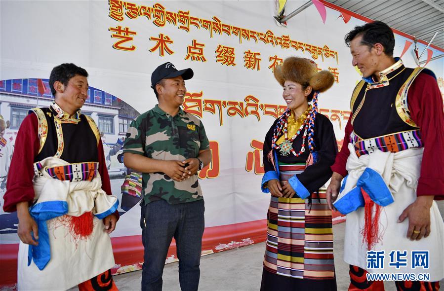 山南市扎囊縣桑耶鎮(zhèn)乃卡村第一書記、駐村工作隊(duì)隊(duì)長(zhǎng)次仁羅布(左二)和村文藝演出隊(duì)演員交流(7月7日攝)。新華社記者張汝鋒攝