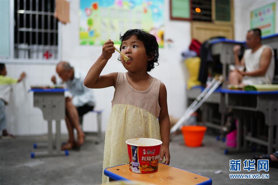 7月9日,小朋友在安置點里吃飯。當日,江西鄱陽縣鄱陽鎮(zhèn)因洪水受災(zāi)的村民被轉(zhuǎn)移到多個集中安置點。在鄱陽縣五一中心學(xué)校安置點,志愿者和工作人員接到任務(wù)后不到十小時內(nèi),為被轉(zhuǎn)移村民布置了28間教室,供519人安頓,并為村民發(fā)放褥子、床單、枕頭、盒飯、飲用水等物資。新華社記者周密攝