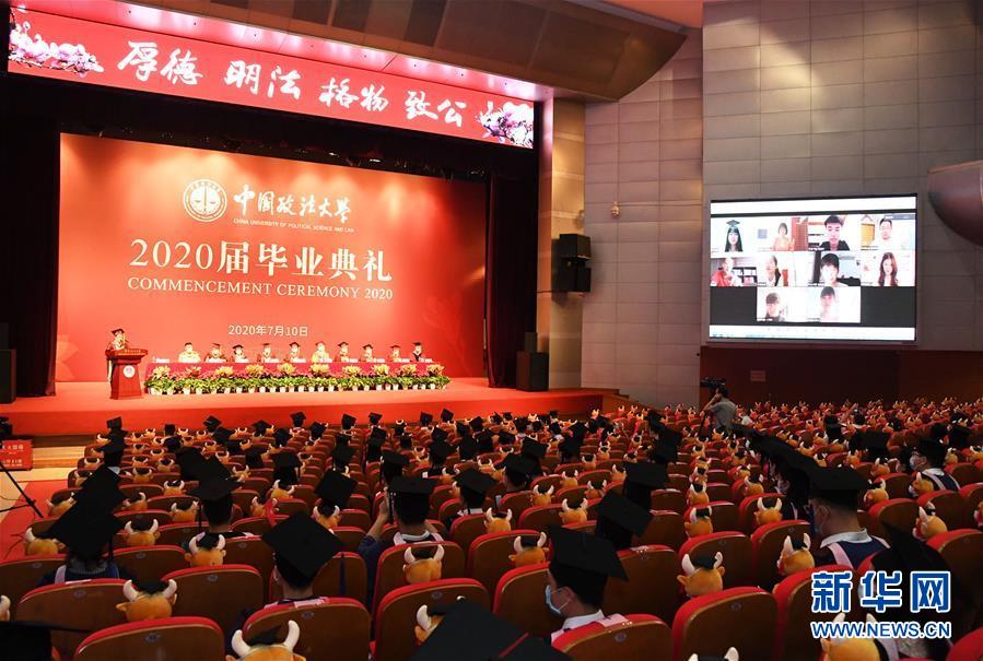 7月10日拍攝的中國(guó)政法大學(xué)2020屆畢業(yè)典禮現(xiàn)場(chǎng)。當(dāng)日,中國(guó)政法大學(xué)舉行2020屆畢業(yè)典禮。由于疫情防控需要,僅少量在校畢業(yè)生在中國(guó)政法大學(xué)昌平校區(qū)禮堂現(xiàn)場(chǎng)參加畢業(yè)典禮,更多畢業(yè)生通過(guò)線上直播參與。新華社記者任超攝