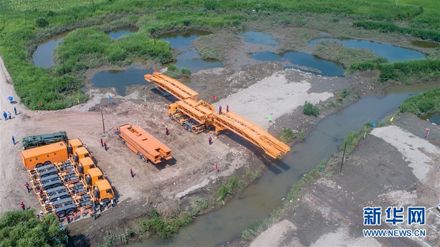 7月10日,工作人員在演練現(xiàn)場(chǎng)搭建機(jī)械化橋梁(無(wú)人機(jī)照片)。當(dāng)日,由吉林省交通運(yùn)輸廳主辦的公路橋梁水毀搶通應(yīng)急演練在長(zhǎng)春市雙陽(yáng)區(qū)雙陽(yáng)河舉行,參與演練人員從汛情水毀信息報(bào)送、應(yīng)急裝備快速集結(jié)、機(jī)械化橋梁搶通搭設(shè)、善后處理等方面進(jìn)行實(shí)戰(zhàn)演練。新華社記者張楠攝