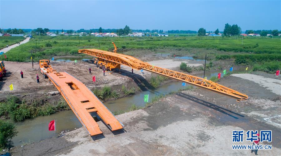 7月10日,工作人員在演練現(xiàn)場(chǎng)搭建機(jī)械化橋梁。當(dāng)日,由吉林省交通運(yùn)輸廳主辦的公路橋梁水毀搶通應(yīng)急演練在長(zhǎng)春市雙陽(yáng)區(qū)雙陽(yáng)河舉行,參與演練人員從汛情水毀信息報(bào)送、應(yīng)急裝備快速集結(jié)、機(jī)械化橋梁搶通搭設(shè)、善后處理等方面進(jìn)行實(shí)戰(zhàn)演練。新華社記者張楠攝