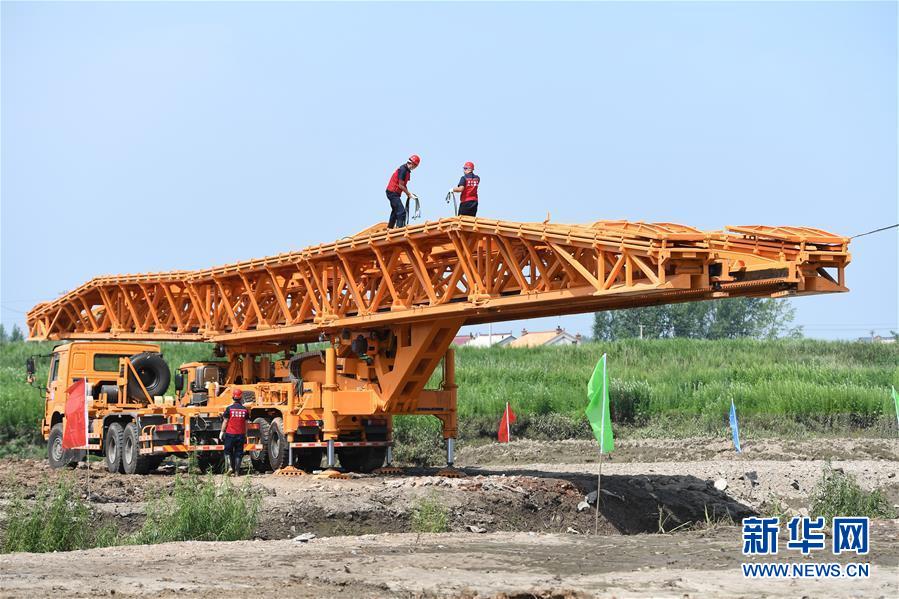 7月10日,工作人員在演練現(xiàn)場搭建機械化橋梁。當日,由吉林省交通運輸廳主辦的公路橋梁水毀搶通應(yīng)急演練在長春市雙陽區(qū)雙陽河舉行,參與演練人員從汛情水毀信息報送、應(yīng)急裝備快速集結(jié)、機械化橋梁搶通搭設(shè)、善后處理等方面進行實戰(zhàn)演練。新華社記者張楠攝