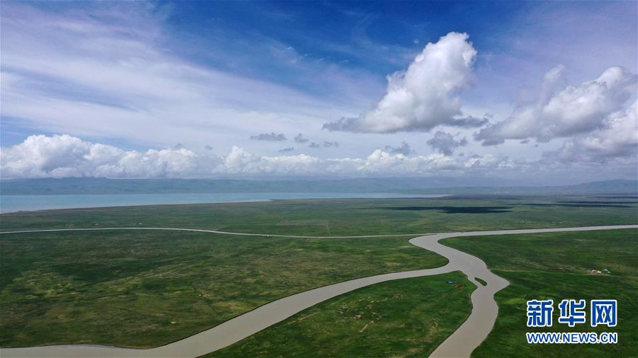 7月10日拍攝的青海湖風(fēng)光(無(wú)人機(jī)照片)。盛夏時(shí)節(jié),被譽(yù)為“中國(guó)最美湖泊”的青海湖畔景色宜人,藍(lán)天、白云、湖水與草原組成一幅壯美的畫(huà)卷。新華社記者張宏祥攝
