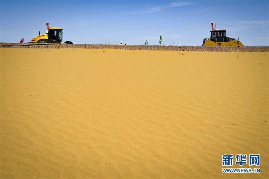 7月10日,工人在位于寧夏境內(nèi)的烏瑪高速青銅峽至中衛(wèi)段A10標(biāo)段施工。盛夏時(shí)節(jié),位于寧夏境內(nèi)的烏瑪(內(nèi)蒙古烏海市至青?,斍呖h)高速青銅峽至中衛(wèi)段正在抓緊施工建設(shè)。該路段主線全長122.9公里,其中穿越騰格里沙漠腹地的18公里公路是寧夏建設(shè)的首條沙漠高速公路,預(yù)計(jì)2021年建成通車。新華社記者馮開華攝。