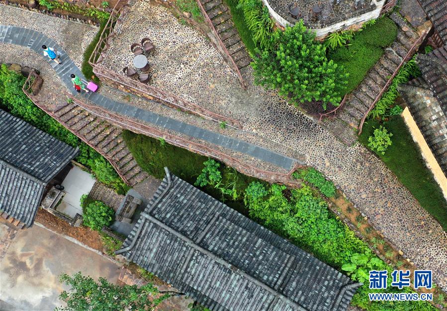 7月11日,游客行走在金秀瑤族自治縣六巷鄉(xiāng)一處民宿內(nèi)(無人機照片)。近年來,廣西金秀瑤族自治縣依托當(dāng)?shù)刈匀簧鷳B(tài)優(yōu)勢,圍繞境內(nèi)豐富的瑤族文化,大力發(fā)展鄉(xiāng)村旅游,精心打造一批獨具瑤族特色的山間民宿酒店,取得良好經(jīng)濟效益。新華社記者 周華 攝
