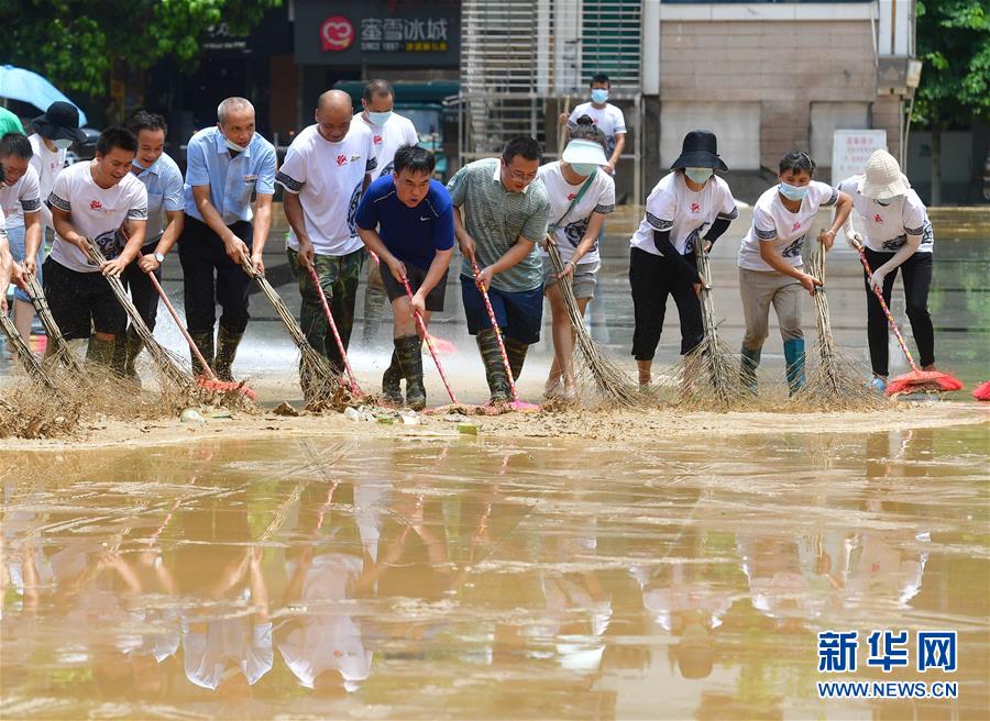 7月12日,融水苗族自治縣文化體育廣電和旅游局清淤小分隊(duì)在蘆笙廣場(chǎng)清理地面。當(dāng)日,在廣西柳州市融水苗族自治縣,融江洪水退去,當(dāng)?shù)叵嚓P(guān)部門組織多支清淤排險(xiǎn)小分隊(duì),積極開展災(zāi)后恢復(fù)工作。新華社記者 黃孝邦 攝