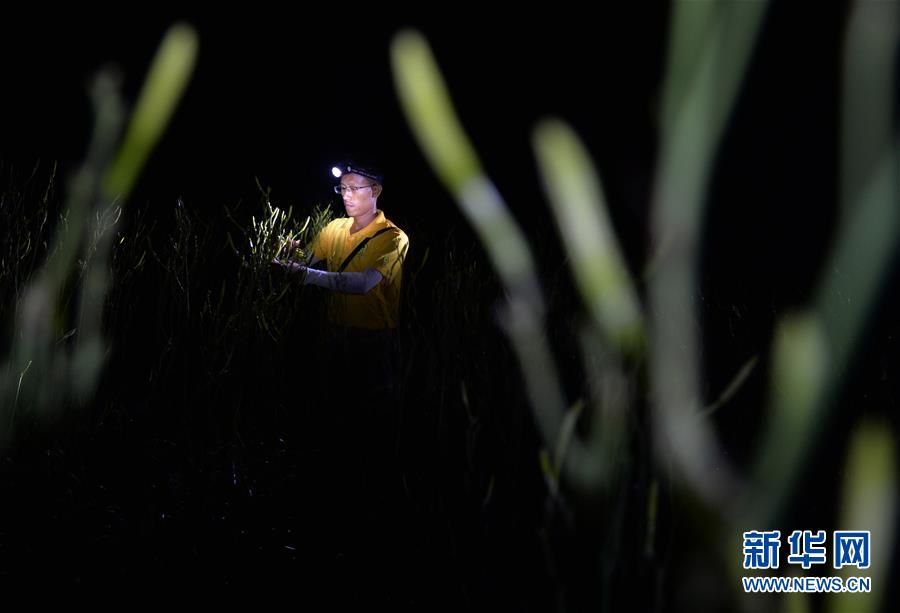 7月12日凌晨,祁東縣官家嘴鎮(zhèn)草源沖村,一名菜農戴著頭燈采摘黃花菜。新華社記者 趙眾志 攝