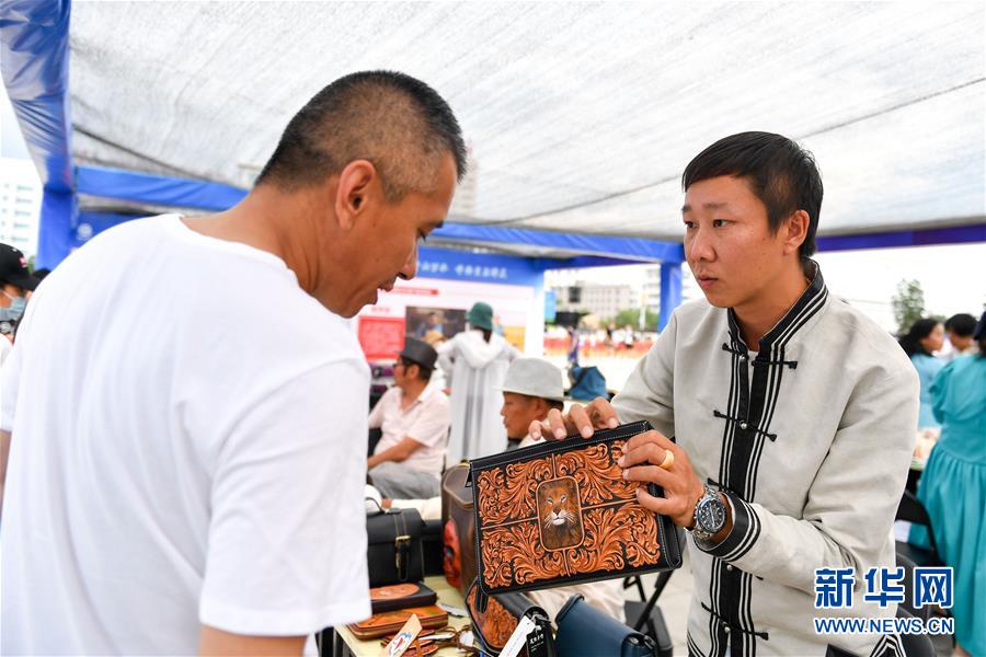 7月12日,在內(nèi)蒙古呼倫貝爾市海拉爾區(qū)惠民展演活動的非遺展區(qū),參展商(右)向游客介紹蒙古族皮雕商品。新華社記者 貝赫 攝