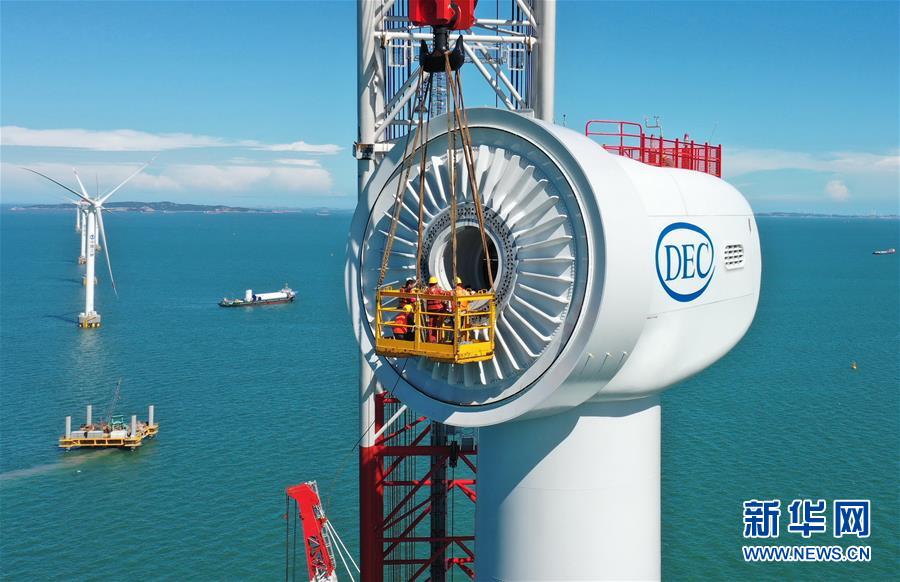 施工人員在福建福清興化灣二期海上風(fēng)電場(chǎng)10兆瓦海上風(fēng)電機(jī)組安裝現(xiàn)場(chǎng)忙碌(6月12日攝,無(wú)人機(jī)照片)。記者7月13日從三峽集團(tuán)了解到,國(guó)內(nèi)首臺(tái)10兆瓦海上風(fēng)電機(jī)組日前在三峽集團(tuán)福建福清興化灣二期海上風(fēng)電場(chǎng)成功并網(wǎng)發(fā)電,這是目前我國(guó)自主研發(fā)的單機(jī)容量亞太地區(qū)最大、全球第二大的海上風(fēng)電機(jī)組,刷新了我國(guó)海上風(fēng)電單機(jī)容量新紀(jì)錄。新華社記者 林善傳 攝