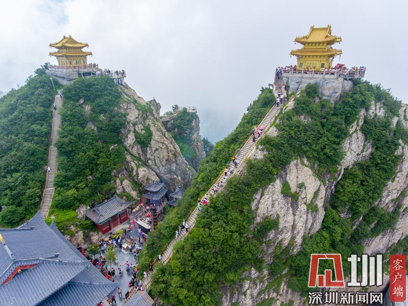 在海拔2217米的山頂上,矗立著3座明清皇家宮殿建筑風(fēng)格的建筑,山峰高聳、山谷深不見(jiàn)底,這些建筑群宛如“漂浮”在云端,巧奪天工,似人間仙境。