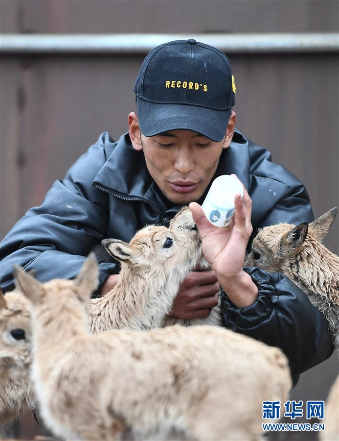 7月8日,三江源國家公園管理局長江源園區(qū)可可西里管理處卓乃湖保護站的工作人員才文多杰在給一只藏羚羊幼仔喂奶。新華社記者 張龍 攝