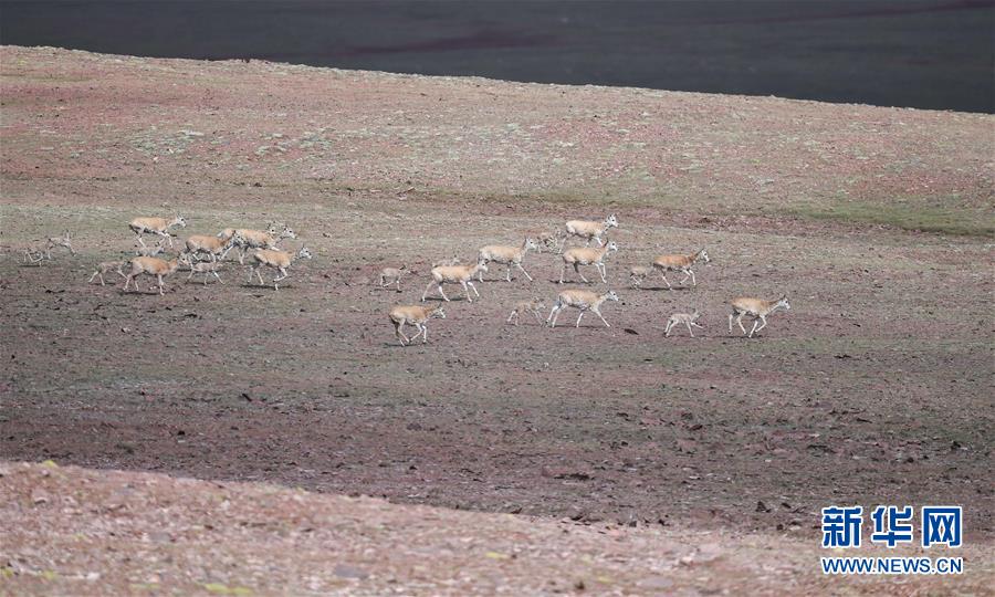 7月7日在可可西里卓乃湖區(qū)域拍攝的藏羚羊。目前正值藏羚羊產(chǎn)仔季。來自青海三江源、新疆阿爾金山、西藏羌塘等地的藏羚羊來到位于青海省可可西里腹地、被譽為“藏羚羊大產(chǎn)房”的卓乃湖區(qū)域產(chǎn)仔。新華社記者 薛玉斌 攝
