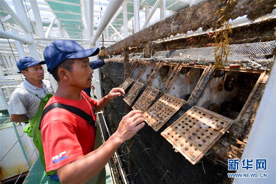 7月14日,在福建省連江縣深遠海養(yǎng)殖平臺“福鮑一號”上,工人在查看鮑魚長勢。新華社記者 姜克紅 攝