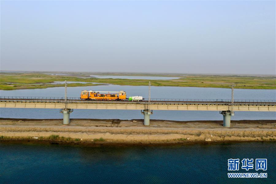鋼軌打磨車在臺(tái)特瑪湖特大橋上作業(yè)(7月14日攝,無(wú)人機(jī)照片)。新華社記者 丁磊 攝