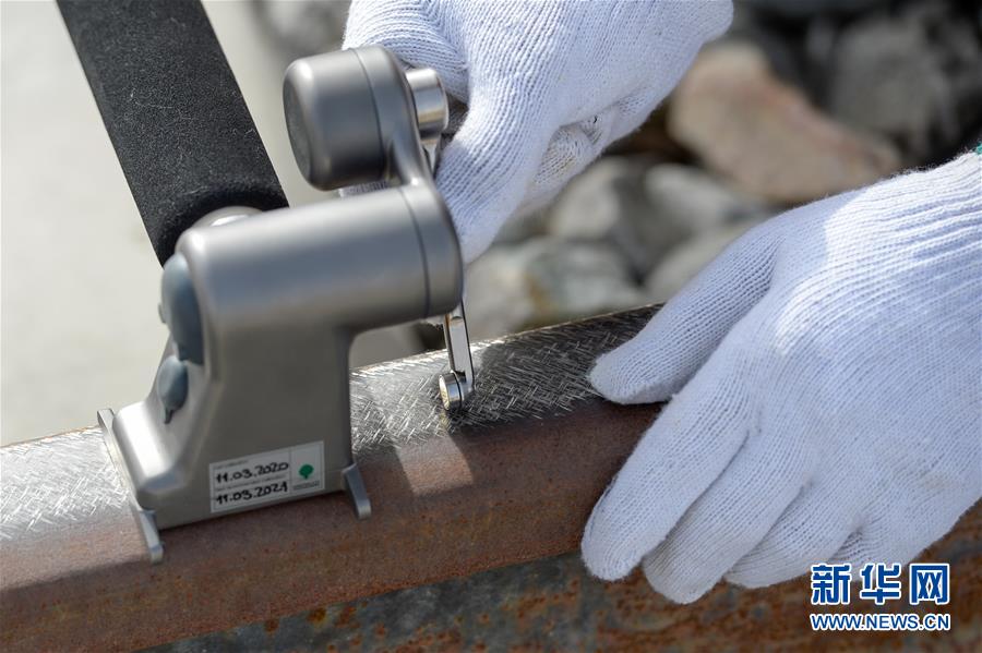 技術(shù)員用儀器進(jìn)行鋼軌廓形檢測(cè)(7月14日攝)。新華社記者 丁磊 攝