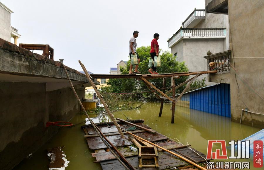 江西鄱陽(yáng)村莊洪水圍困 留守村民劃船外出取生活物資